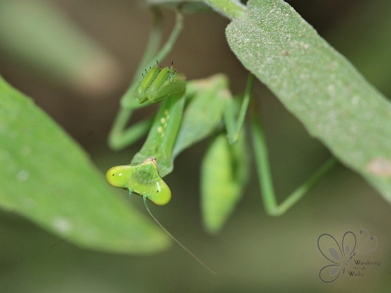 Like all mantises, they have a triangular head and forward facing eyes that give them binocular vision, a great advantage in catching prey. Their color can range from bright green to dull brown and are often cryptically-colored to match the background of their habitat. Females can grow up to 10 cm in length and males are always smaller. As adults, both have distinctive white spots on their wings, which you can see in the photo below if you look closely.