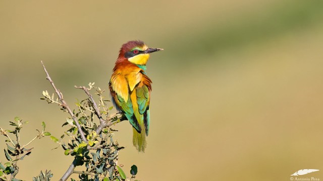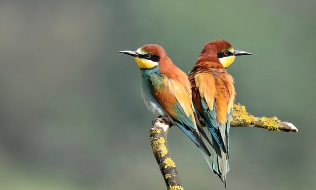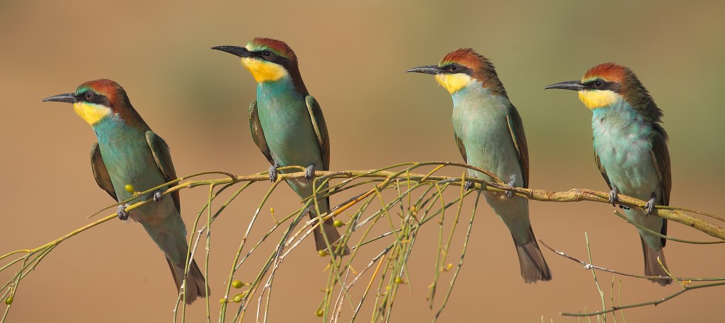 European Bee-eaters are also known as Golden Bee-eaters because of their beautiful coloration. In Sinai, the Jebeliya tribe call them banat barik in Arabic, meaning “sparkling girls”. Bee-eaters are slender birds with chestnut-colored crowns and mantles, bright yellow throats and lower backs, and rich turquoise blue breasts and bellies. They sport a black face mask and breast band that divides their yellow throat from their blue breasts. Males and females look similar, but the females tend to be slightly paler and less colorful. Although quite distinctive, it is possible to confuse these European bee-eaters with their beautiful cousins, the Blue-cheeked Bee-eaters (Merops persicus).