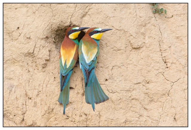 European bee-eaters are typically monogamous, pair bonds lasting for several years and sometimes for life. Their nests are tunnels dug into steep walls, vertical banks, or trenches. Each tunnel is about 1.5 – 2 m long and are excavated by both sexes. Both males and females care for the eggs.