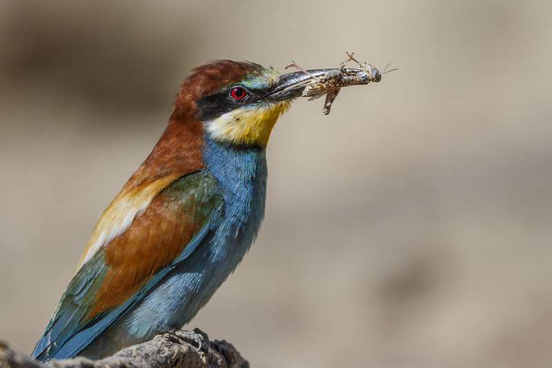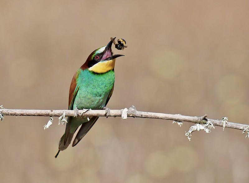 As their name suggests, they feed on bees, but their prey ultimately depends on weather conditions, region, and breeding season. Hundreds of species have been identified as prey, including wasps, hornets, flies, dragonflies, butterflies, moths, bugs, cicadas, water scorpions, mantids, beetles, grasshoppers, locusts, and winged ants and termites. Some smaller insects are eaten in flight, others are brought back to a perch where the bird beats or rubs the insect against the perch to kill it before tossing it up in the air and swallowing it. It has often been assumed that the birds do this to remove stingers and venom, but this has been shown to be incorrect. Stingers are often swallowed and the venom is not removed. Further research is needed to determine if toxins actually enter the birds’ tissues and whether their colorful plummage is therefore acting as a warning coloration.